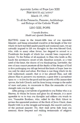 Once praised as Leo’s “last testament” shortly after its publication, Pervenuti all’anno is a very timely document for its scope on the Church as it entered the twentieth century. One hundred and sixteen years later, this Apostolic Letter can be said to be rather prophetic and speaks to the present moment.