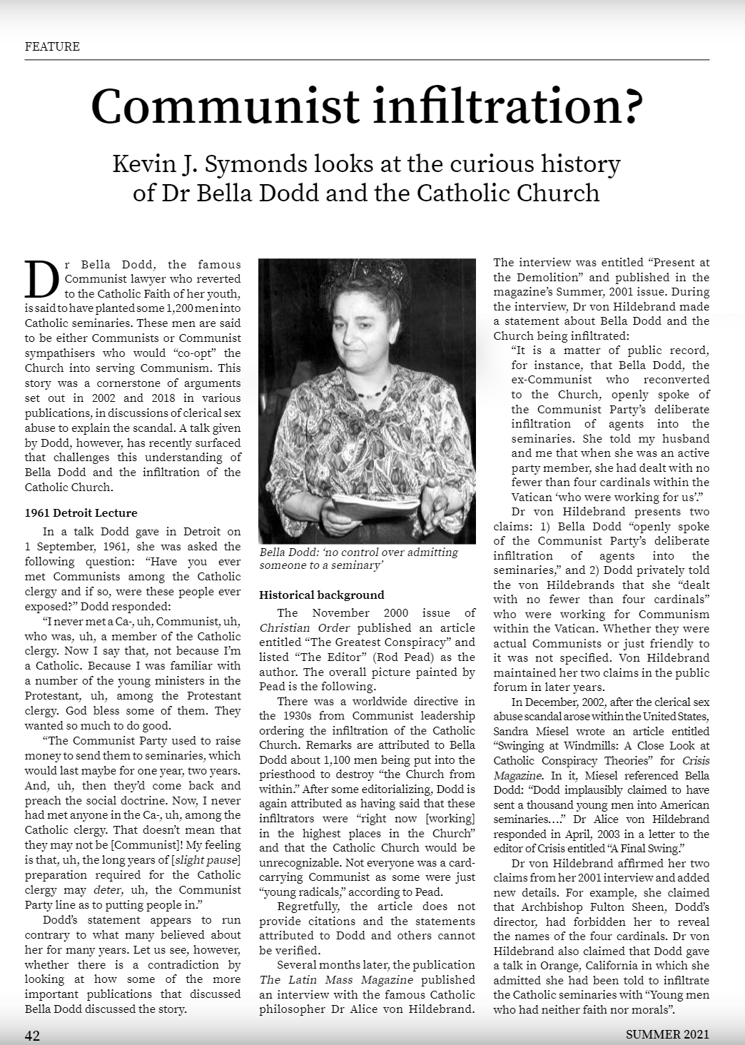 Dr. von Hildebrand presents two claims: 1) Bella Dodd “openly spoke of the Communist Party’s deliberate infiltration of agents into the seminaries,” and 2) Dodd privately told the von Hildebrands that she “dealt with no fewer than four cardinals” that were working for Communism within the Vatican. Whether they were actual Communists or just friendly to it was not specified. Von Hildebrand maintained her two claims in the public forum in later years.