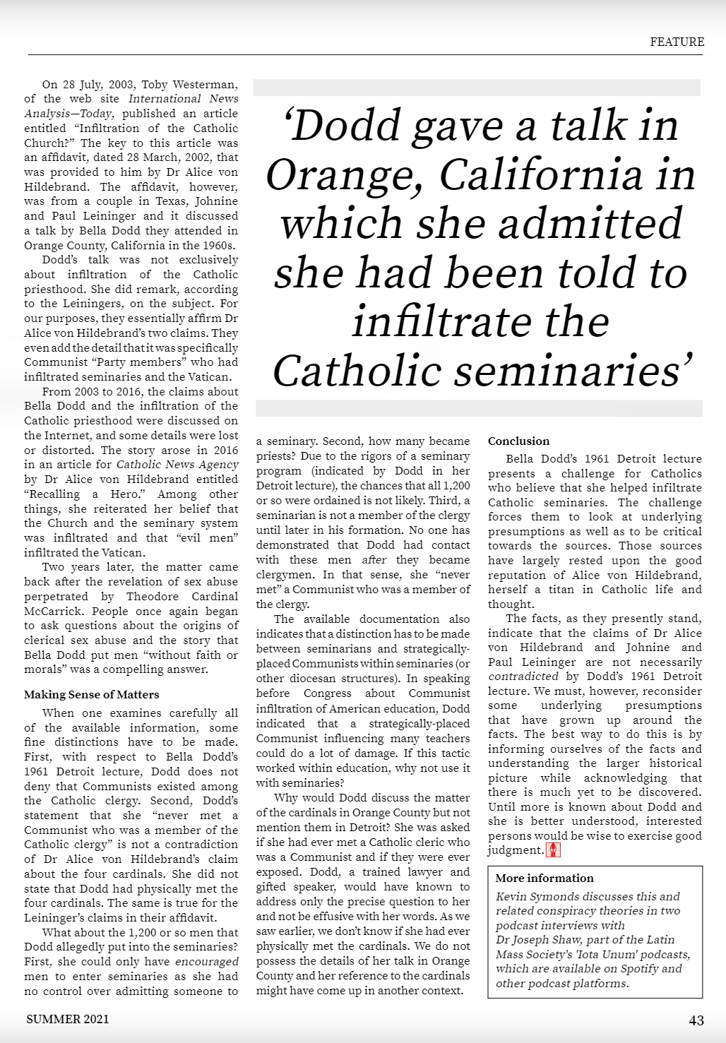 Dodd’s talk was not exclusively about infiltration of the Catholic priesthood. She did remark, according to the Leiningers, on the subject. For our purposes, they essentially affirm Dr. Alice von Hildebrand’s two claims. They even add the detail that it was specifically Communist “Party members” who had infiltrated seminaries and the Vatican.